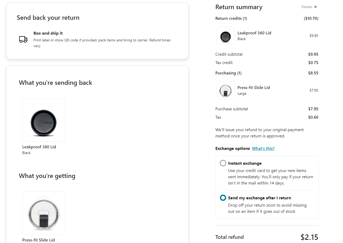 On the final page, you will be presented with your return summary. You'll be able to select between an instant exchange, which will require you to enter your credit card information to protect your return and create your exchange immediately, or a traditional exchange in which your new order is not created until your return is received back at our facilities.